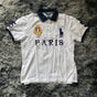 Antwort 1: Das Poloshirt bietet elegante Details wie ein aufwendig gesticktes Emblem mit goldenen Akzenten und einer französischen Flagge auf der Brust sowie einen großen Schriftzug "PARIS" in dunkelblauen Buchstaben, der dem Design eine besondere Ausstrahlung verleiht. Die rechte Seite ist mit einer großen Reiterstickerei verziert, die den sportlichen und luxuriösen Look betont.